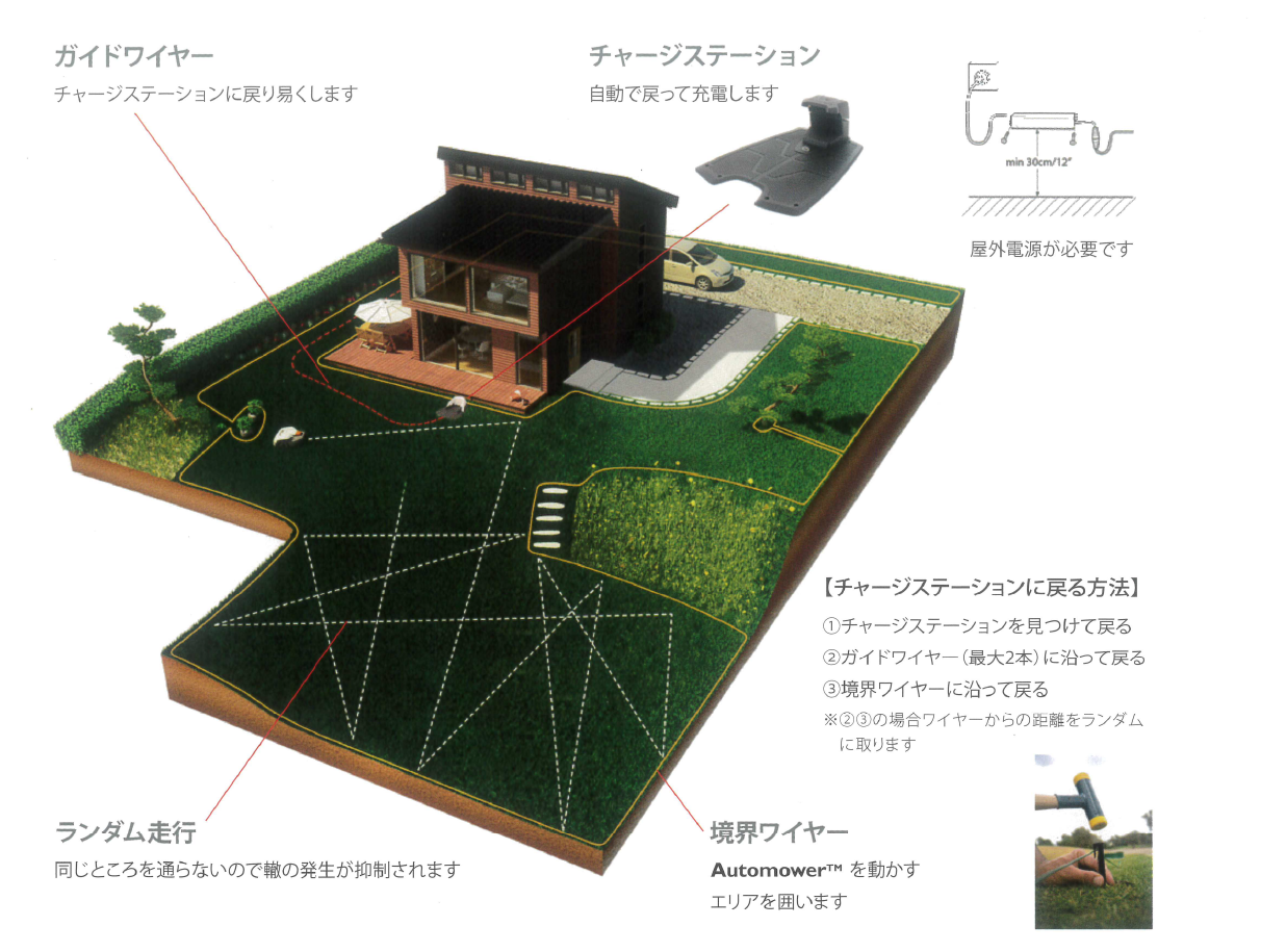 オートモア(ロボット芝刈機)は芝刈を自動で行う芝刈ロボットです。芝刈をさせたい場所の外周を境界ワイヤーで囲み、そのワイヤー内を指定された時間に稼働し芝刈をしてくれます。普通の芝刈機と大きく違うところは、全て自動です。決められた時間に決められた芝高さで芝刈をしてくれます。